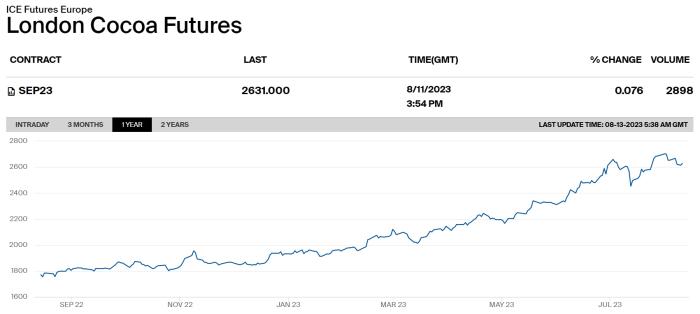 中新財經記者在洲際交易所查詢發現,倫敦可可期貨這波上漲,自去年底開始,8月1日一度漲至每噸2703英鎊的新高點,近日持續在高位徘徊。