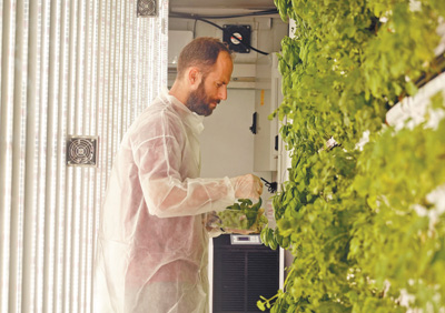 以色列一家農業科技公司在超市、餐館和購物中心的室內外安裝了多處便攜式城市垂直農場裝置。在這樣的“農場”中,蔬菜垂直排列在墻壁上的容器里,減少對水和土壤的使用,提高種植效率,供顧客選購。圖為一名工作人員在一家超市旁的垂直農場查看蔬菜生長情況。