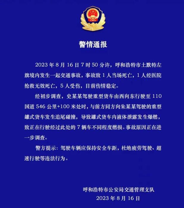 經(jīng)初步調(diào)查,史某某駕駛重型貨車由西向東行駛至110國道546公里+100米處時,與前方同方向朱某某駕駛的重型罐式貨車發(fā)生追尾碰撞,導(dǎo)致罐式貨車內(nèi)液體泄露發(fā)生爆燃,致正在行駛經(jīng)過此處的7輛車不同程度燃損。事故原因正在進一步調(diào)查。