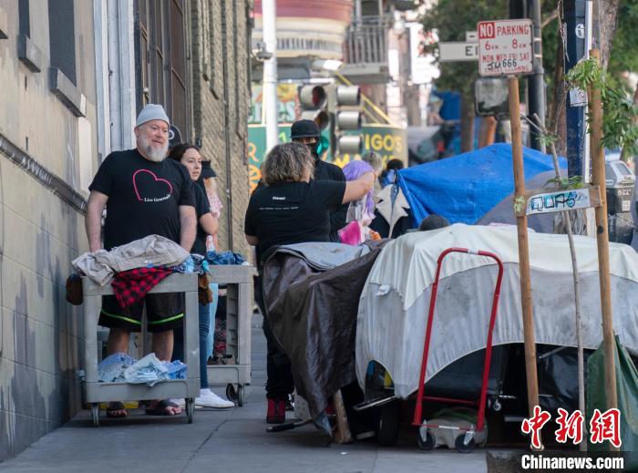 當地時間8月18日,慈善機構救世軍組織的工作人員和志愿者在美國舊金山田德隆區街頭分發食物和衣服。中新社記者 劉關關 攝