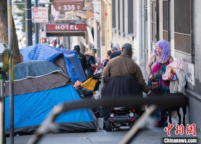 當地時間8月18日,無家可歸者從美國舊金山田德隆區街頭經過。中新社記者 劉關關 攝