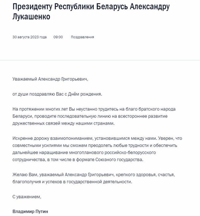 據(jù)報(bào)道,克里姆林宮網(wǎng)站發(fā)布了生日賀電內(nèi)容。賀電中稱,多年來,盧卡申科一直為白俄羅斯的人民利益不懈努力。普京表示真誠(chéng)珍視同白俄羅斯的互信關(guān)系。