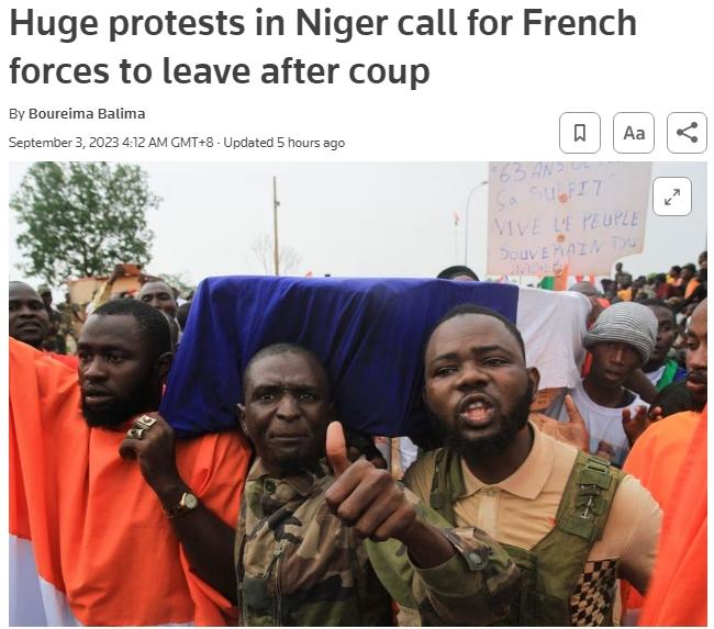 中新網9月3日電 據路透社報道,當地時間2日,尼日爾爆發大規模反法示威,數萬名抗議者聚集在首都尼亞美的一座法國軍事基地外,要求法國軍隊撤出尼日爾。