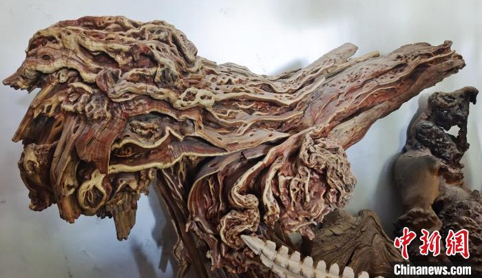 中新網(wǎng)新疆阿拉爾9月2日電(史玉江)一根腐朽的樹根,或許在別人眼里一文不值,可是在戴新看來,朽木可雕琢,那些腐朽的樹根不僅能做成工藝品,還能增收致富。“在阿拉爾這片土地上,各種樹根和朽木段,不管是沙漠中的,還是河道里的,只要我看上,都盡可能搬回來。”新疆生產(chǎn)建設(shè)兵團(tuán)第一師阿拉爾市“非遺”根雕傳承人戴新說,通過自己的雙手制作的根雕作品,讓他的生活樂趣無限。