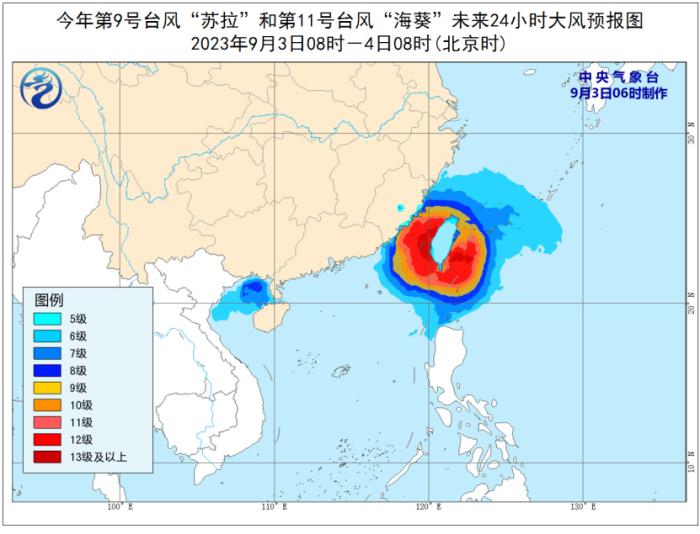 9月3日08時至4日08時,受“??庇绊懀褪亢{、臺灣海峽、臺灣以東洋面、東海南部及釣魚島附近海域以及浙江南部沿海、福建沿海、臺灣島沿海將有6-8級、陣風9-10級大風,部分海域或地區的風力有9-12級,陣風13-14級,“海葵”中心經過的附近海面或地區的風力有13-16級,陣風17級。