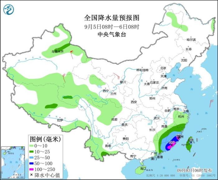 9月5日08時至6日08時,新疆沿天山地區、浙江南部、福建大部、江西東南部、廣東中東部、臺灣島等地部分地區有中到大雨,其中,福建東南部、廣東東部等地部分地區有暴雨或大暴雨(100~200毫米)。內蒙古西北部、青海西部等地部分地區有4~6級風,其中,新疆東部部分地區有8~9級風。東海南部、臺灣以東洋面、臺灣海峽、巴士海峽、南海東北部有6~8級大風、陣風10~11級,其中臺灣以東洋面、臺灣海峽、巴士海峽北部、南海東北部部分海域風力可達9~11級、陣風13~14級。