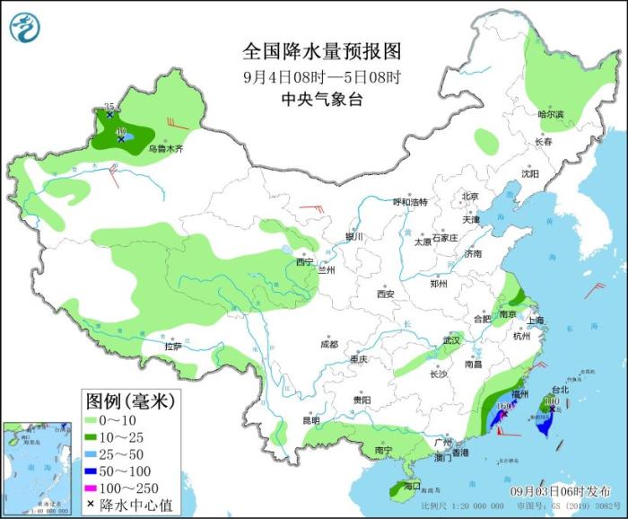 9月4日08時至5日08時,新疆沿天山地區和伊犁河谷、福建東南部、廣東東部、海南島西北部、臺灣島等地部分地區有中到大雨,其中,福建東南部沿海地區、廣東東南部沿海、臺灣島東部等地部分地區有暴雨或大暴雨(100~160毫米)。內蒙古西北部、新疆南疆盆地、福建東部沿海等地部分地區有5~7級風。東海南部、臺灣以東洋面、臺灣海峽、巴士海峽、南海東北部有6~8級大風、陣風10~11級,其中臺灣以東洋面、臺灣海峽、巴士海峽北部、南海東北部部分海域風力可達9~11級、陣風13~14級。