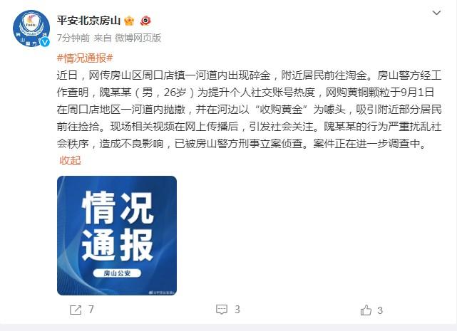 中新網9月3日電 3日,北京市公安局房山分局官方微博發布情況通報稱,近日,網傳房山區周口店鎮一河道內出現碎金,附近居民前往淘金。房山警方經工作查明,隗某某(男,26歲)為提升個人社交賬號熱度,網購黃銅顆粒于9月1日在周口店地區一河道內拋撒,并在河邊以“收購黃金”為噱頭,吸引附近部分居民前往撿拾?,F場相關視頻在網上傳播后,引發社會關注。隗某某的行為嚴重擾亂社會秩序,造成不良影響,已被房山警方刑事立案偵查。案件正在進一步調查中。
