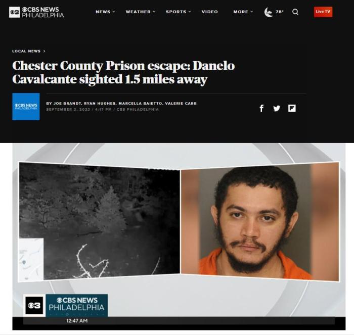 據報道,該犯人為34歲的達內洛·卡瓦爾坎特。當地時間8月31日上午,他在等待被轉移至州監獄時,從賓州費城郊區的監獄越獄,官方尚未透露其越獄的細節。