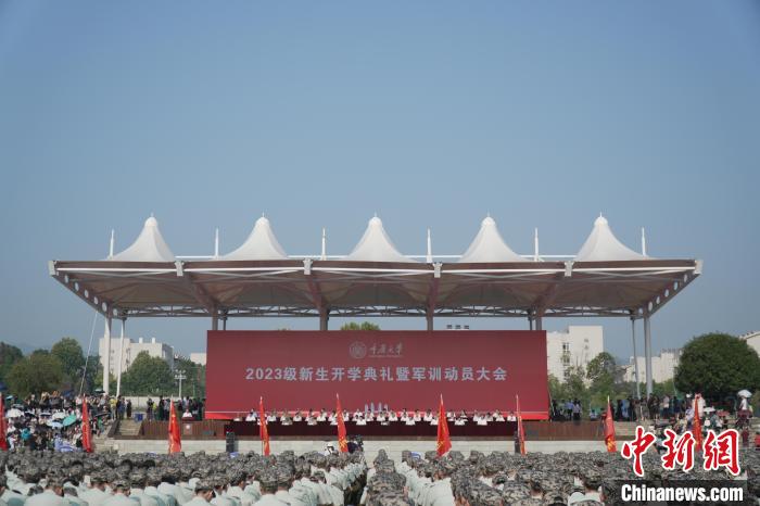 圖為重慶大學2023級本科生開學典禮暨軍訓動員大會現場。中新網記者周毅攝