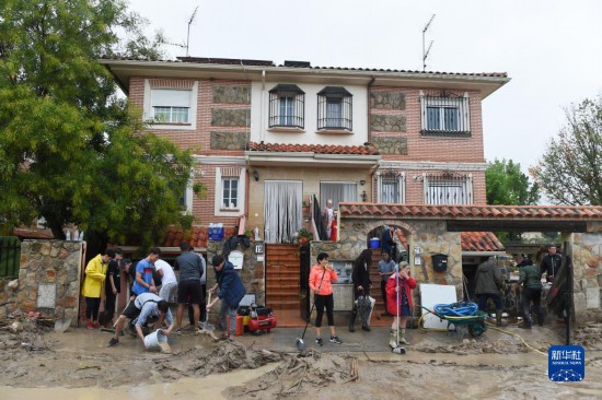 9月4日,居民在西班牙馬德里比利亞曼塔鎮清理淤泥。新華社發(古斯塔沃·巴連特攝)