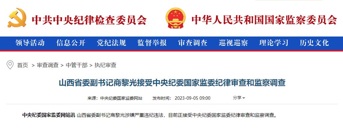 中新網北京9月5日電 5日上午,中央紀委國家監委網站發布消息,山西省委副書記商黎光涉嫌嚴重違紀違法,目前正接受中央紀委國家監委紀律審查和監察調查。