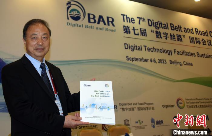 9月4日,第七屆“數字絲路”國際會議在北京開幕,DBAR主席郭華東院士展示當天最新發布的《地球大數據助力“一帶一路”可持續發展》報告。中新網記者 孫自法 攝