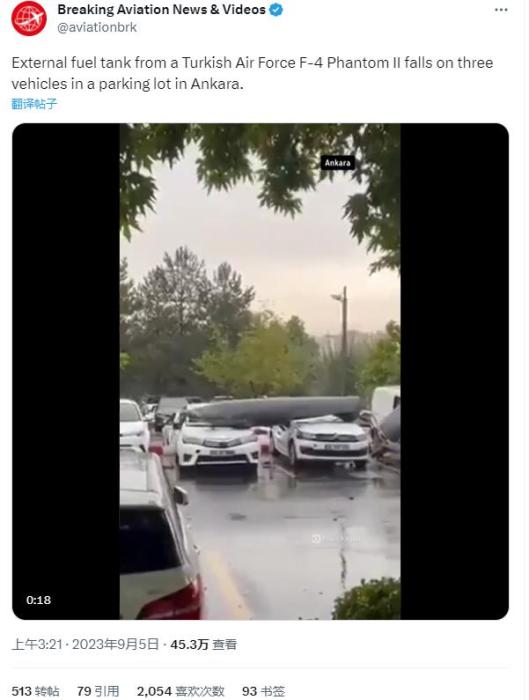 中新網9月6日電 綜合外媒報道,當地時間9月4日,土耳其空軍一架戰斗機在飛行途中油箱突然掉落,砸中安卡拉市一露天停車場的汽車,所幸未造成人員傷亡。