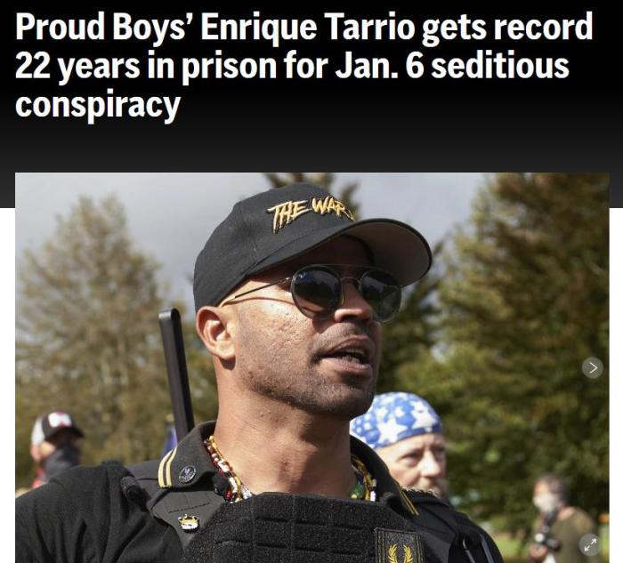 據報道,涉嫌幕后策劃2021年1月6日美國國會騷亂的極右翼組織“驕傲男孩”前主席塔里奧(Enrique Tarrio),于當地時間5日在華盛頓特區聯邦法院被判處22年監禁刑期,被控煽動陰謀等罪名。