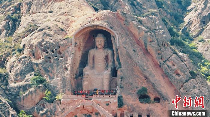 據悉,須彌山石窟始鑿于北魏孝文帝太和年間,現存洞窟162座,造像1000余軀,壁畫200多平方米,碑刻16方,漢藏西夏文題記53處,分布在4平方公里的五座大山崖面上。作為須彌山石窟的“名片”,第5窟唐代彌勒大佛坐像鑿于紅砂巖質山體之上,高達20.6米,儀態威嚴、神情端莊,帛帶袈裟、面龐豐腴,造像氣勢宏偉,雕鑿技藝嫻熟。