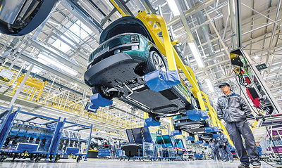 長江經濟帶生產制造和出口的新能源汽車日漸成為中國出口的“金名片”。圖為一家車企江蘇常州基地的工人在加緊生產。