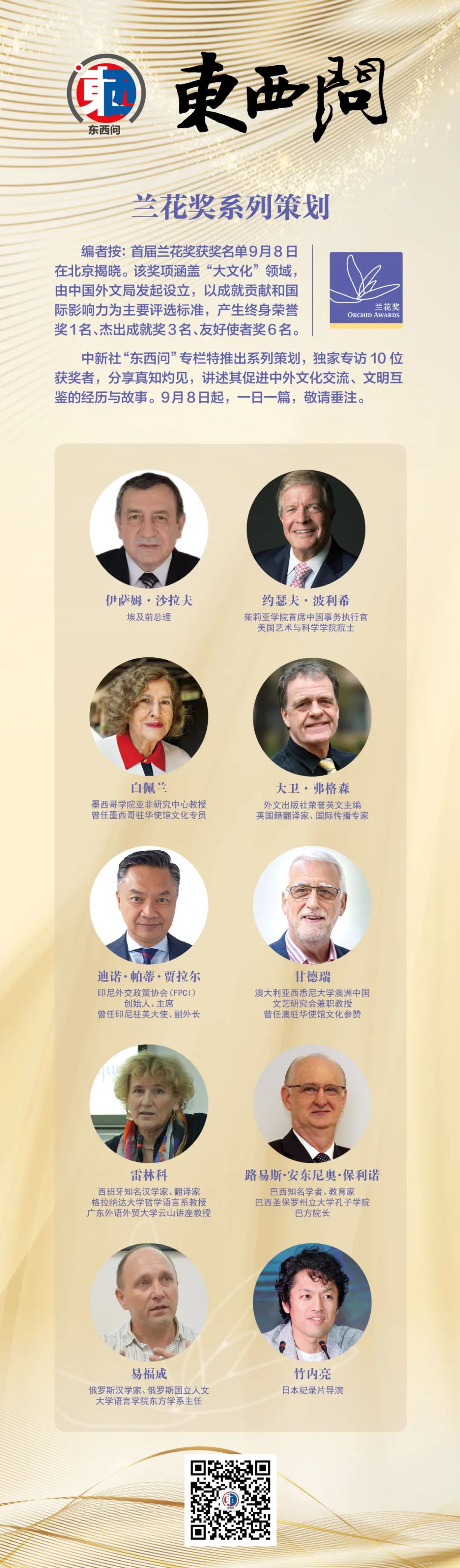 編者按: 首屆蘭花獎(jiǎng)獲獎(jiǎng)名單9月8日在北京揭曉。該獎(jiǎng)項(xiàng)涵蓋“大文化”領(lǐng)域,由中國(guó)外文局發(fā)起設(shè)立,以成就貢獻(xiàn)和國(guó)際影響力為主要評(píng)選標(biāo)準(zhǔn),產(chǎn)生終身榮譽(yù)獎(jiǎng)1名、杰出成就獎(jiǎng)3名、友好使者獎(jiǎng)6名。