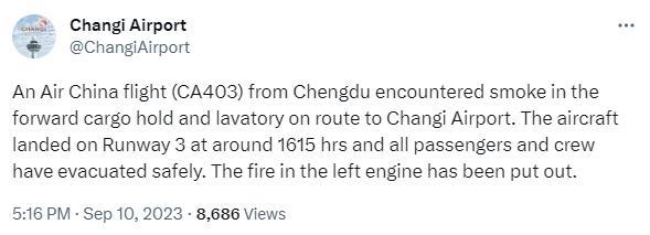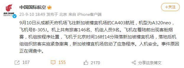 另據中國國際航空官方微博消息,10日從成都天府機場飛往新加坡樟宜機場的CA403航班在著陸前出現客艙煙霧,機組按程序處置,飛機于北京時間16時14分降落新加坡樟宜機場,落地后機組組織旅客實施緊急撤離,新加坡樟宜機場啟動了應急程序。人機安全。事件原因正在調查中。