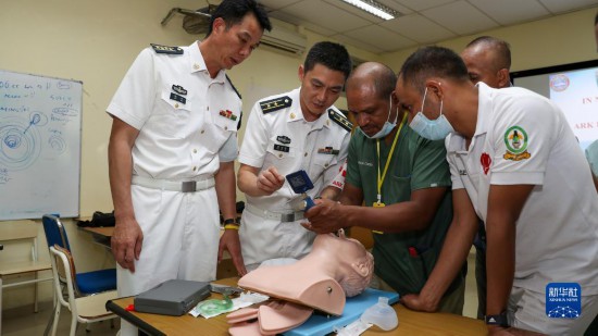 中國海軍“和平方舟”號醫院船派出醫療專家分隊赴東帝汶國立醫院進行ACLS培訓,醫院船醫療專家為當地醫護人員進行實操講解(9月5日攝)。新華社記者 黎云 攝