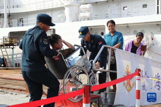 中國海軍“和平方舟”號醫院船訪問東帝汶并開展醫療服務期間,醫院船官兵為當地行動不便的患者服務(9月6日攝)。新華社發(桂江波 攝)