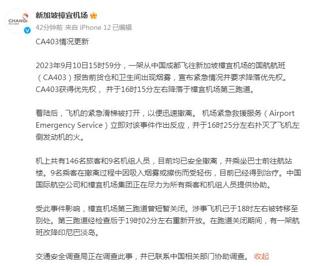 中新網北京9月10日電 據新加坡樟宜機場官方微博消息,2023年9月10日15時59分,一架從中國成都飛往新加坡樟宜機場的國航航班(CA403)報告前貨倉和衛生間出現煙霧,宣布緊急情況并要求降落優先權。CA403獲得優先權, 并于16時15分左右降落于樟宜機場第三跑道。
