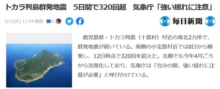 9月8日至12日,日本鹿兒島縣吐噶喇群島持續發生地震,5天內地震超320次。圖片來源:日本《每日新聞》報道截圖