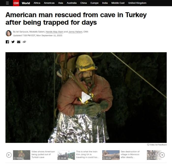 中新網9月12日電 綜合外媒報道,當地時間12日凌晨,被困在土耳其一處地下洞穴1000多米深處多日的美國洞穴探險家馬克·迪基,被成功救出。