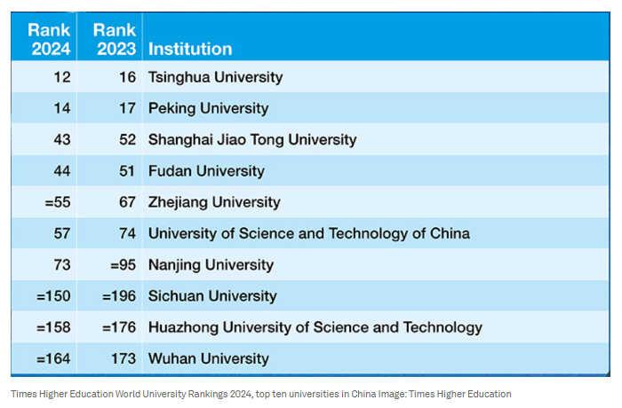 文章注意到,中國有史以來首次有兩所大學躋身世界大學排名前15。清華大學(從排名第16升至第12)和北京大學(從第17升至第14)逐步接近全球前十,超越了賓夕法尼亞大學、約翰·霍普金斯大學和哥倫比亞大學等美國一流大學。