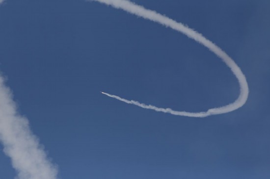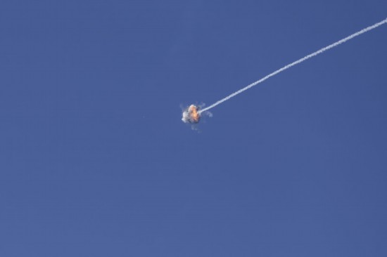 ↑10月7日,在以色列南部城市阿什克隆,以色列“鐵穹”防御系統(tǒng)導(dǎo)彈成功攔截從加沙地帶發(fā)射的火箭彈。新華社發(fā)(伊蘭·阿薩亞格攝/基尼圖片社)