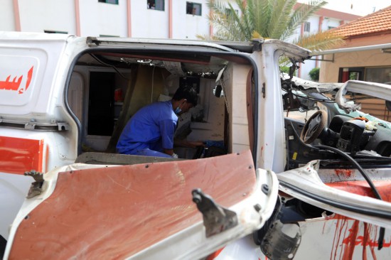 ↑這是10月7日在加沙地帶城市汗尤尼斯拍攝的在以色列空襲中受損的救護(hù)車。新華社發(fā)(哈立德·奧馬爾攝)