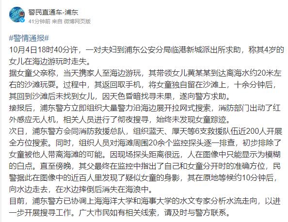 接報(bào)后,浦東警方立即組織大量警力沿海邊展開拉網(wǎng)式搜索,消防部門出動(dòng)了紅外感應(yīng)無人機(jī),相關(guān)人員進(jìn)行了徹夜搜尋,始終未發(fā)現(xiàn)女童蹤跡。