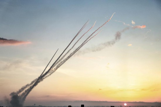 這是10月7日在加沙地帶城市拉法拍攝的向以色列發射的火箭彈。(新華社發,哈立德·奧馬爾攝)