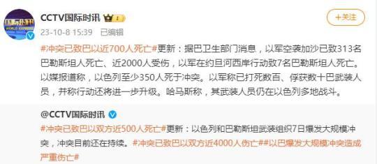 央視網消息:據CCTV國際時訊微博消息,據巴衛生部門消息,以軍空襲加沙已致313名巴勒斯坦人死亡、近2000人受傷,以軍在約旦河西岸行動致7名巴勒斯坦人死亡。以媒報道稱,以色列至少350人死于沖突。以軍稱已打死數百、俘獲數十巴武裝人員,并稱行動還將進一步升級。哈馬斯稱,其武裝人員仍在以色列多地戰斗。