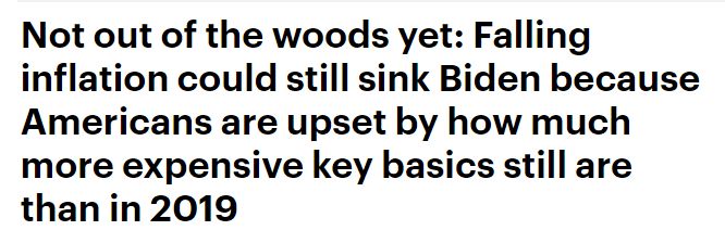 報道援引美國數字新聞網站(Axios)的民調稱,美國民眾對本國經濟的看法十分糟糕。這其中很重要的原因就是,民眾在日常生活中更關注所需商品的絕對價格,而這一價格目前依然過高。盡管近期美國通脹率有所下降,但商品價格還在上漲,只是比以前稍慢了一些。