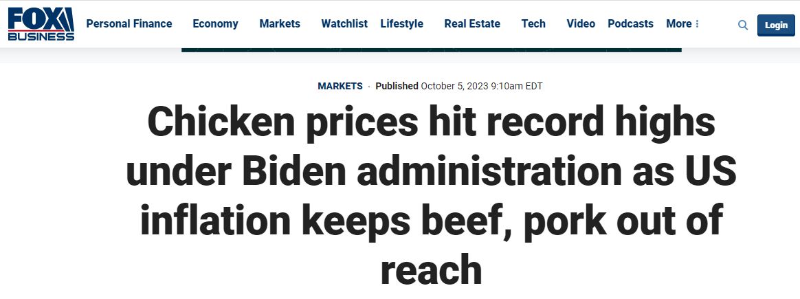 另據美國福克斯商業頻道(Fox Business)網站報道,受到持續通貨膨脹影響,美國牛肉和豬肉價格保持高位,普通消費者不得不轉向略微便宜一些的雞肉。然而,全美零售店的雞肉價格也隨著需求量的增加而水漲船高,更是創下歷史新高,并且預計還將保持在高位。