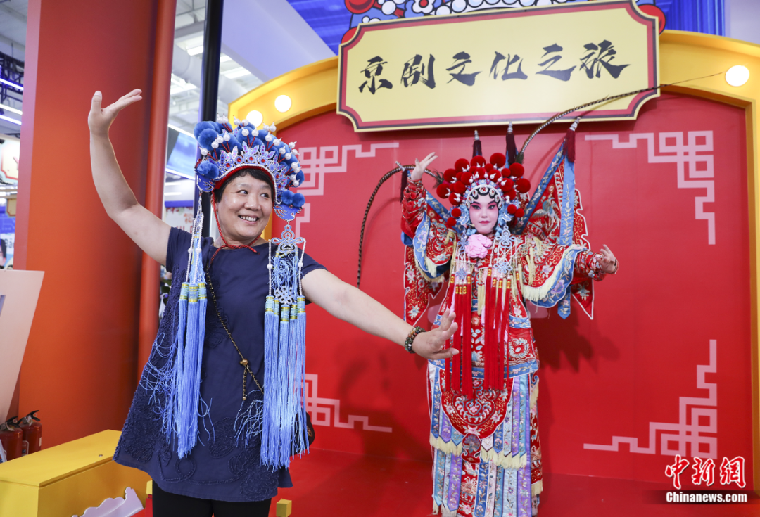 2023年中國國際服務貿易交易會(服貿會)在北京舉行,觀眾在首鋼園區“京劇文化之旅”展臺模仿京劇演員表演《穆桂英》片段。趙雋 攝