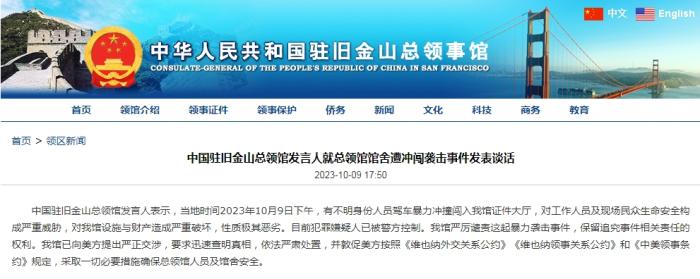 中新網10月10日電 據中國駐舊金山總領館網站消息,中國駐舊金山總領館發言人表示,當地時間2023年10月9日下午,有不明身份人員駕車暴力沖撞闖入中國駐舊金山總領館證件大廳,對工作人員及現場民眾生命安全構成嚴重威脅,對中國駐舊金山總領館設施與財產造成嚴重破壞,性質極其惡劣。
