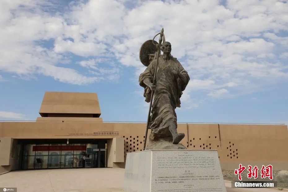 資料圖:位于新疆維吾爾自治區的高昌故城前,現陳列有唐代高僧玄奘的塑像,玄奘西行求法時曾途經此地。