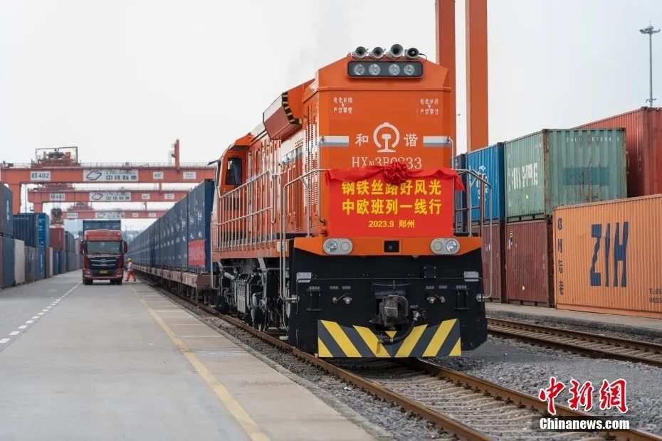 2023年9月17日,河南鄭州,一列滿載醫療器械、汽車配件等貨物的中歐班列(鄭州)從中國鐵路鄭州局集團有限公司圃田車站駛出,將經中國二連浩特開往德國漢堡。