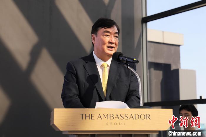 圖為中國駐韓國大使邢海明致辭。中新社發 中國駐韓國大使館 供圖