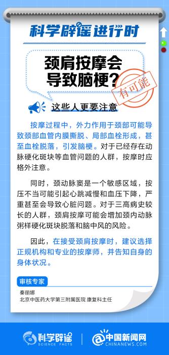 中新網(wǎng)10月12日電 按摩過程中,外力作用于頸部可能導(dǎo)致頸部血管內(nèi)膜撕脫、局部血栓形成,甚至血栓脫落,引發(fā)腦梗。在接受頸肩按摩時,建議選擇正規(guī)機構(gòu)和專業(yè)的按摩師,并告知自身的身體狀況。(來源:@科學(xué)辟謠 @中國新聞網(wǎng) )