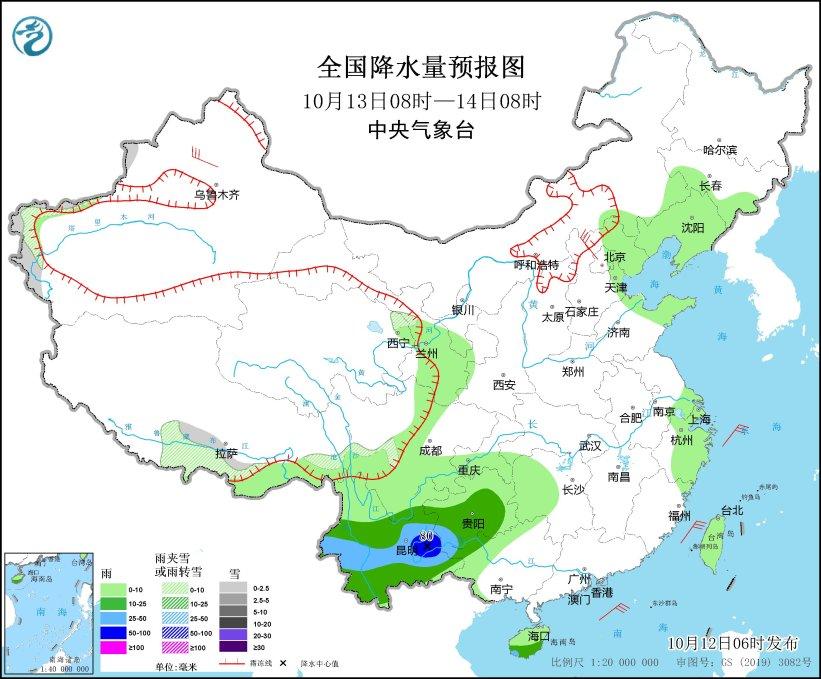 10月13日08時至14日08時,新疆西部、西藏南部等地部分地區有小雪或雨夾雪;四川南部、貴州中南部、云南大部等地部分地區有中到大雨,其中,云南東部局地有暴雨(50~80毫米)。新疆西北部、河北北部等地部分地區有5~6級風;臺灣海峽、巴士海峽、南海北部海域、北部灣等海域有5~7級風、陣風8級。(見圖2)。