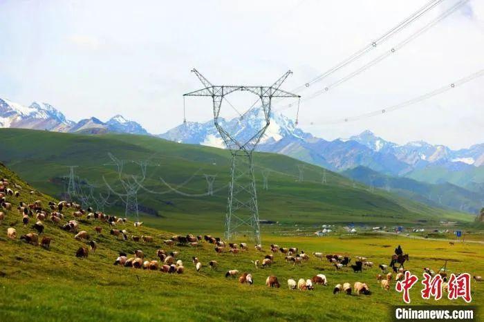 資料圖:750千伏輸電線路橫穿南疆巴音布魯克草原,環境生態和諧共生。張利民 攝