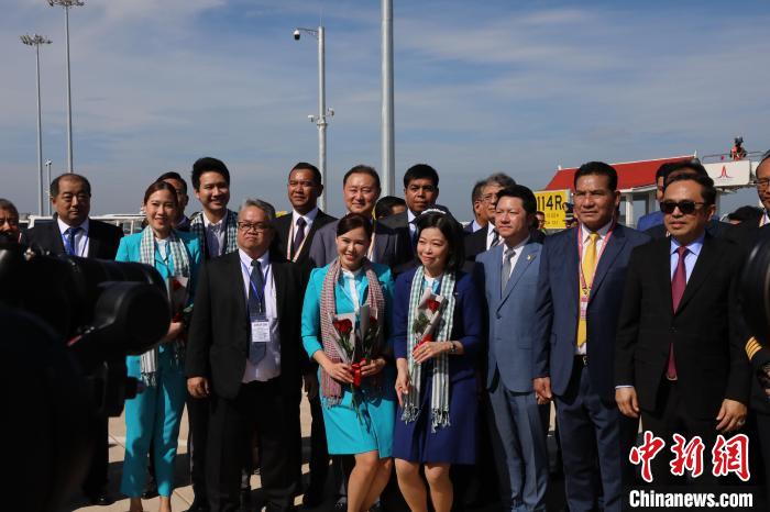 10月16日,柬埔寨暹粒吳哥國(guó)際機(jī)場(chǎng)通航運(yùn)營(yíng)。圖為柬埔寨官員等嘉賓代表在停機(jī)坪與機(jī)組成員合影。(黎海月 攝)