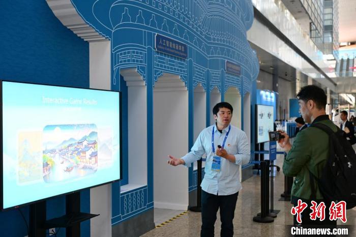 在人工智能繪畫和動畫體驗區,體驗者只需在現場觸控屏前隨意勾畫線條輪廓,智能引擎將據此生成意境超拔的山水畫卷,讓觀眾體驗前沿科技與傳統繪畫交融之趣。體驗區內的智能引擎還可建構虛擬人物,生成動畫短片暢游打卡勝地,讓體驗者置身于古都風貌和現代生活。