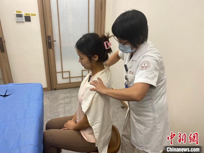 接下來許麗用手微微握拳,在記者左邊肩頸處反復做著“來回滾動”的動作。“這叫‘?法’,可以充分放松肌肉,它是一種柔和有力、剛柔并濟的中醫推拿代表性手法。”許麗說,記者群體中,肩頸疼痛是最普遍的問題。“高強度的工作會讓記者常感到頭暈、肩背酸脹,這時需要一定的肌肉放松才能消除不適感。”