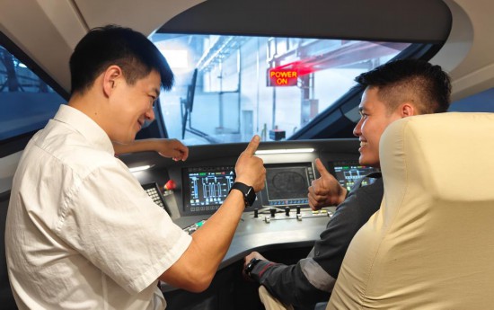 8月25日,在印度尼西亞萬(wàn)隆的雅萬(wàn)高鐵德卡魯爾動(dòng)車(chē)所內(nèi),中國(guó)師傅穆振(左)在向印尼火車(chē)司機(jī)塞蒂亞萬(wàn)講解動(dòng)車(chē)組出庫(kù)前的上電作業(yè)。