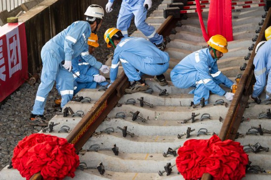 3月31日,在印度尼西亞雅加達(dá)雅萬(wàn)高鐵哈利姆車(chē)站,工人鋪設(shè)雅萬(wàn)高鐵全線最后一根鋼軌。