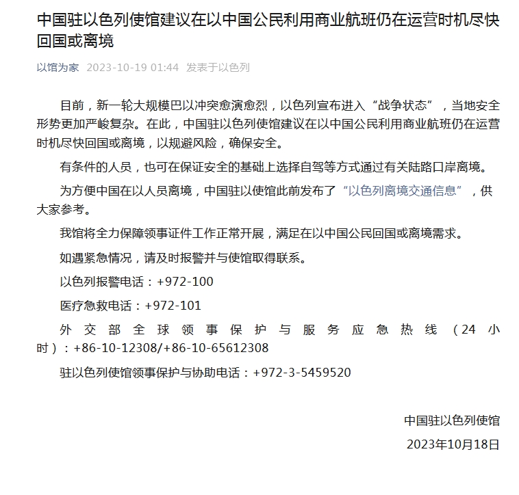 為方便中國在以人員離境,中國駐以使館此前發布了“以色列離境交通信息”。中國駐以使館將全力保障領事證件工作正常開展,滿足在以中國公民回國或離境需求。